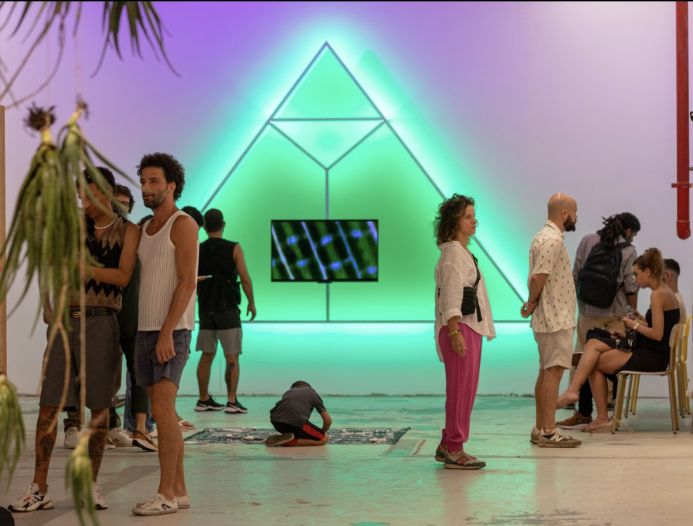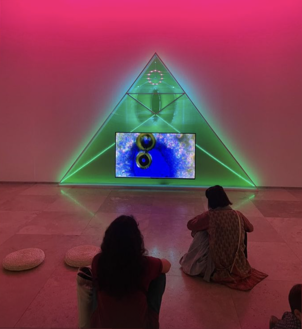 1- Matrix Vegetal (Patricia Dominguez)“Matrix Vegetal de Patricia Domínguez es una investigación multimedia que abarca la etnobotánica experimental, la filosofía cuántica sudamericana, narrativas oníricas y tecnologías de conectividad orgánica. En su afán por abrir una puerta al reino cuántico y comprender mejor el funcionamiento de las plantas y sus espíritus, durante un mes la artista ejerció como aprendiz de Amador Aniceto, curandero residente en Madre de Dios (Perú). Bajo su guía, Domínguez perfeccionó su capacidad para relacionarse con el lenguaje y la sabiduría vibrantes del reino vegetal. Se separó conscientemente de la «matriz digital» y, con una paciencia y concentración inquebrantables, cultivó una conexión simbiótica tanto con las plantas como con la matriz vegetal. Matrix Vegetal está formada por un vídeo monocanal, enmarcado por una estructura triangular de luces LED verdes. Estas luces fluorescentes simbolizan la investigación de la artista sobre los efectos de la colonización, la globalización y la hipercomercialización en Sudamérica. Al mismo tiempo, la obra transmite una perspectiva poética de la existencia contemporánea, intrincadamente entrelazada con la tierra. En palabras de Domínguez, «enciendo mi máscara terapéutica LED hecha en China y la pongo en una frecuencia de luz verde». Las luces LED, que sirven como metáfora del sistema tardocapitalista – y, en consecuencia, de la degradación ecológica—, se emplean para establecer y delinear un espacio de resistencia. Dentro de este espacio, la sabiduría y los recuerdos ancestrales toman forma, ofreciendo vías para sanar las heridas del trauma colonial y fomentando nuevos mitos de resistencia multiespecie. La instalación se completa con dos acuarelas y un altar vegetal, cuidadosamente ensamblado con ofrendas dedicadas a la matriz vegetal. En sus acuarelas oníricas, Domínguez conjura reinos tecnológicamente animados en los que seres humanos, plantas, animales y objetos entablan un diálogo sin fisuras, tejiendo nuevas «tecnologías de encantamiento»: visiones para remodelar las infraestructuras de las zonas muertas geofísicas y tecnocientíficas de la modernidad que buscan ofrecer nuevas posibilidades de transformación. Patricia Domínguez (CL), Matrix vegetal (2021-2022), Comisionado por Screen City Biennial, con el apoyo de Cecilia Brunson Projects y Galería Patricia Ready. Video escrito, dirigido y editado por Patricia Domínguez. Asistencia de cámara y fotografía de Emilia Martín. Postproducción: Thomas Woodroffe . Efectos VFX de Thomas Woodroffe y Simón Jarpa. El reparto incluye a: Claudia Blin y el loro Pedrito. Música de Futuro Fósil. Diseño de sonido de Patricia Domínguez con efectos de sonido adicionales de Ce Pams. Imágenes laboratorio Fernán Federici. Rodado en Madre de Dios, Perú 2021. Agradecimientos: Amador Aniceto y Rosa Inoué, El universo vegetal”, Mas informacion en este documento: https://www.studiovegetalista.com/_files/ugd/186a9f_dfec46dff0b7476cbacedd9c9ba295c5.pdf